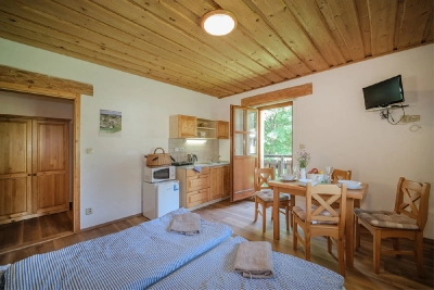 Pokoj je velký 38 m2, skládá se ze dvou místností a předsíňky. Pokoj má koupelnu se sprchovým koutem, vanou a toaletou a další toaleta je zvlášť v předsíňce. Dalším vybavením pokoje je manželská postel (rozměr 180×200 cm), lednička, skříň a komoda v jedné místnosti, v druhé místnosti jsou dvě jednolůžka (rozměr 90×200 cm), skříň a komoda. Pokoj s manželskou postelí je průchozí do koupelny. Každý pokoj v rámci apartmánu má sezení se stolkem a dvěma křesílky.