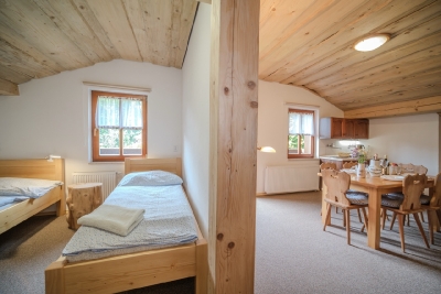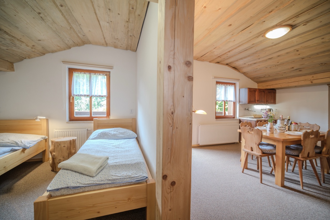 Postel: 1 manželská postel, 2x jednolůžková postel, možnost jedné přistýlky